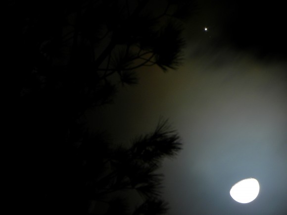 It wasn’t until the next morning that I discovered that what I was witnessing was a Jupiter moon – an unusual pass-by of the massive, gaseous planet in line with our moon – easily the brightest lights in the night sky. This convergence won’t happen again for another 13 years.